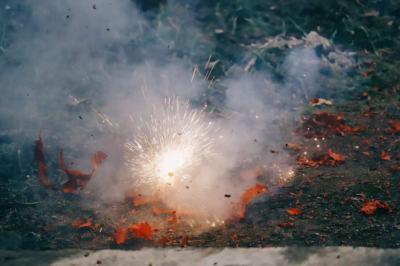 烟火在地面轰然炸开,璀璨的火花如星芒四射,白色烟雾迅速弥漫,枯黄的树叶受冲击纷飞,满是热烈的氛围感。(2024级化学工程与工艺1班 董浩)
