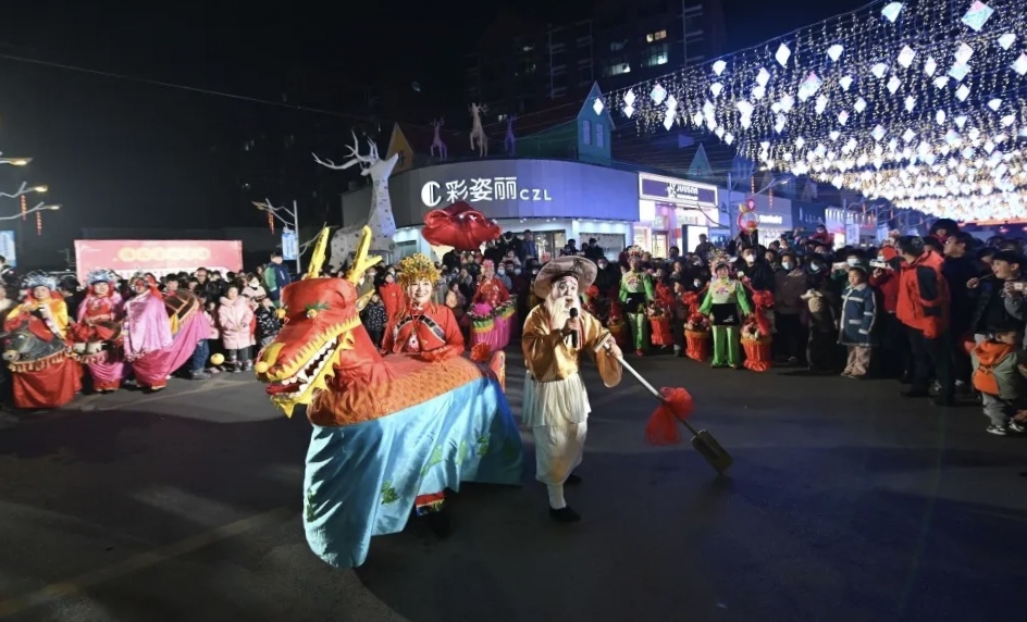 夜幕下,街头热闹非凡。民俗表演队伍盛装登场,扮相各异的演员们带来精彩演绎,祥龙灵动,人群簇拥,点点华灯闪烁,洋溢着浓郁的欢乐氛围。(2024级应用化学1班 胡波)