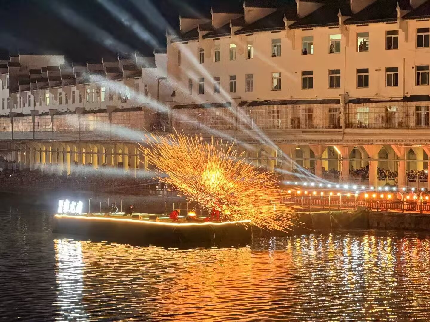 夜晚水畔的绚烂场景——河中平台上,表演者打造出如烟花绽放般的铁花景观,金色火花四射。岸边建筑林立,灯光与铁花的光影倒映在水中,氛围热烈而迷人。(2024级应用化学(对口)1班 闻钰禄)