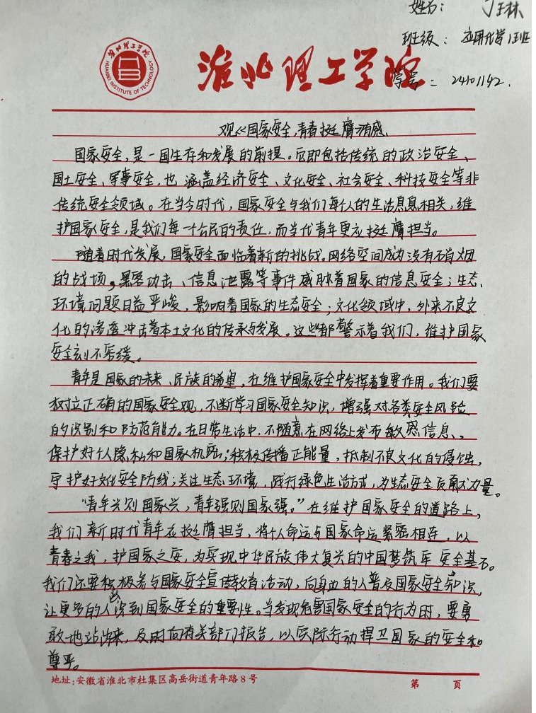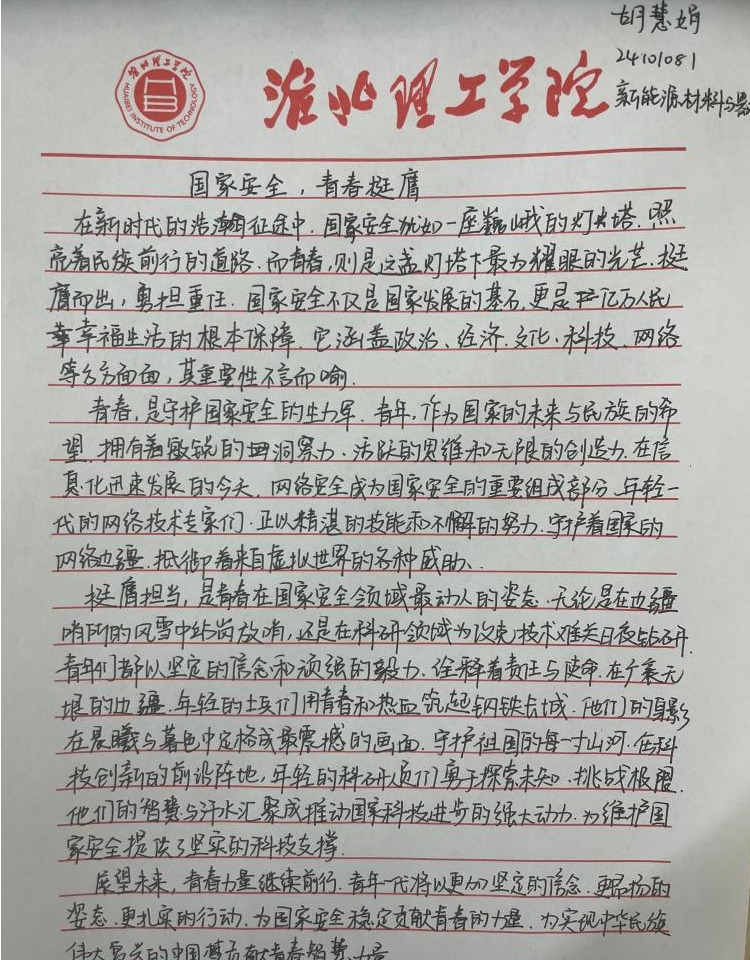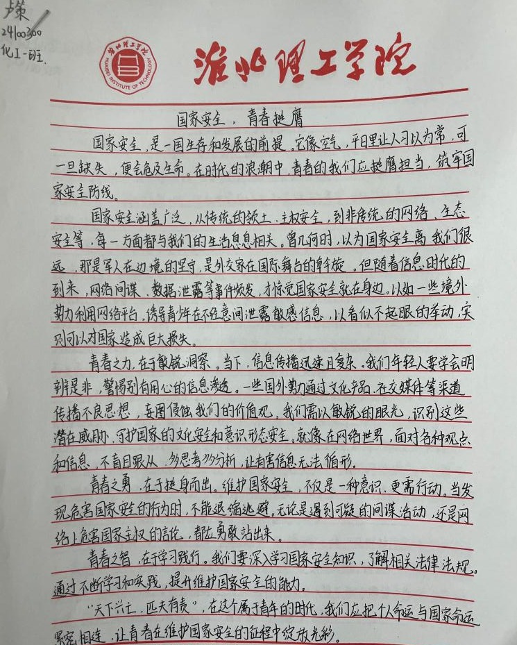 “国家安全,青春挺膺”感悟心得征集活动得到了同学们的积极响应,大家结合系列活动的参与体验,纷纷拿起笔,写下自己对国家安全的深刻感悟。有的同学在心得中写道:“国家安全是国家生存发展的基石,作为新时代青年,我们应立足专业,努力学习,为国家的文化安全和科技创新贡献力量。”还有的同学表示:“通过这次活动,我更加明白国家安全就在身边,我们要从点滴做起,自觉维护国家尊严和荣誉,以实际行动践行青春挺膺的誓言。”这些真挚的感悟,凝聚着同学们对国家安全的深刻理解和担当意识,也展现了v站体育官网青年学子积极向上的精神风貌。