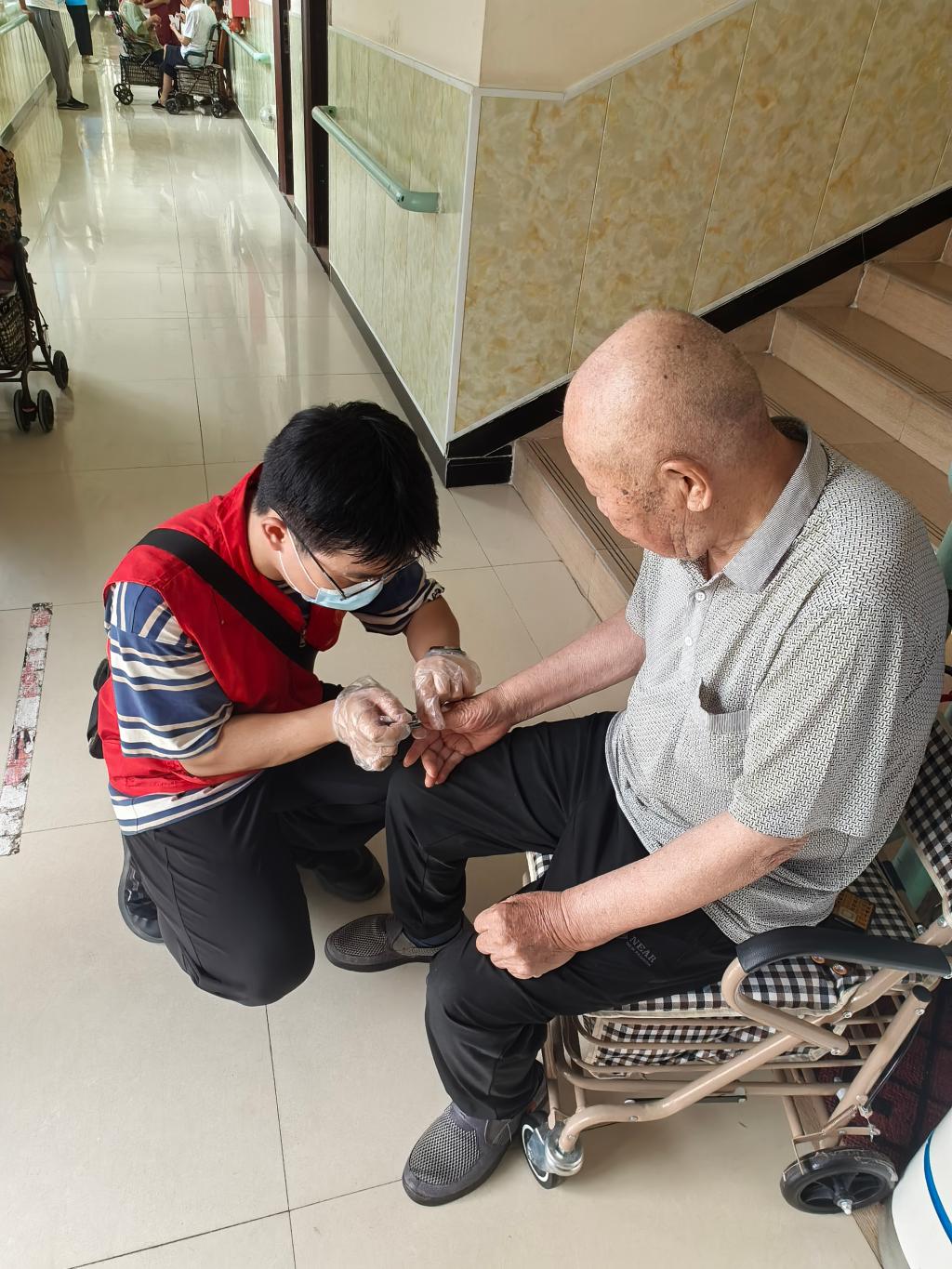 9月3日下午,志愿者们携带提前准备的指甲剪、毛巾、文艺表演道具等物资抵达养老院。在养老院工作人员的引导下,志愿者们迅速分成三组开展服务:生活照料组的同学轻手轻脚走进老人房间,仔细为老人整理床铺、更换干净枕套,将褶皱的被单铺展平整,还耐心询问老人的生活需求,陪老人唠起家常;健康关怀组的同学则围坐在老人身边,一边温柔地为老人修剪指甲,一边讲解日常手部护理小知识,动作轻柔细致,生怕弄疼老人,老人们脸上纷纷露出欣慰的笑容;才艺表演组的同学在养老院活动大厅搭起临时“舞台”,歌曲《我和我的祖国》、《小手拍拍》等节目轮番上演,通俗易懂的表演引发老人阵阵掌声,不少老人还跟着旋律轻轻哼唱,现场氛围温馨融洽。