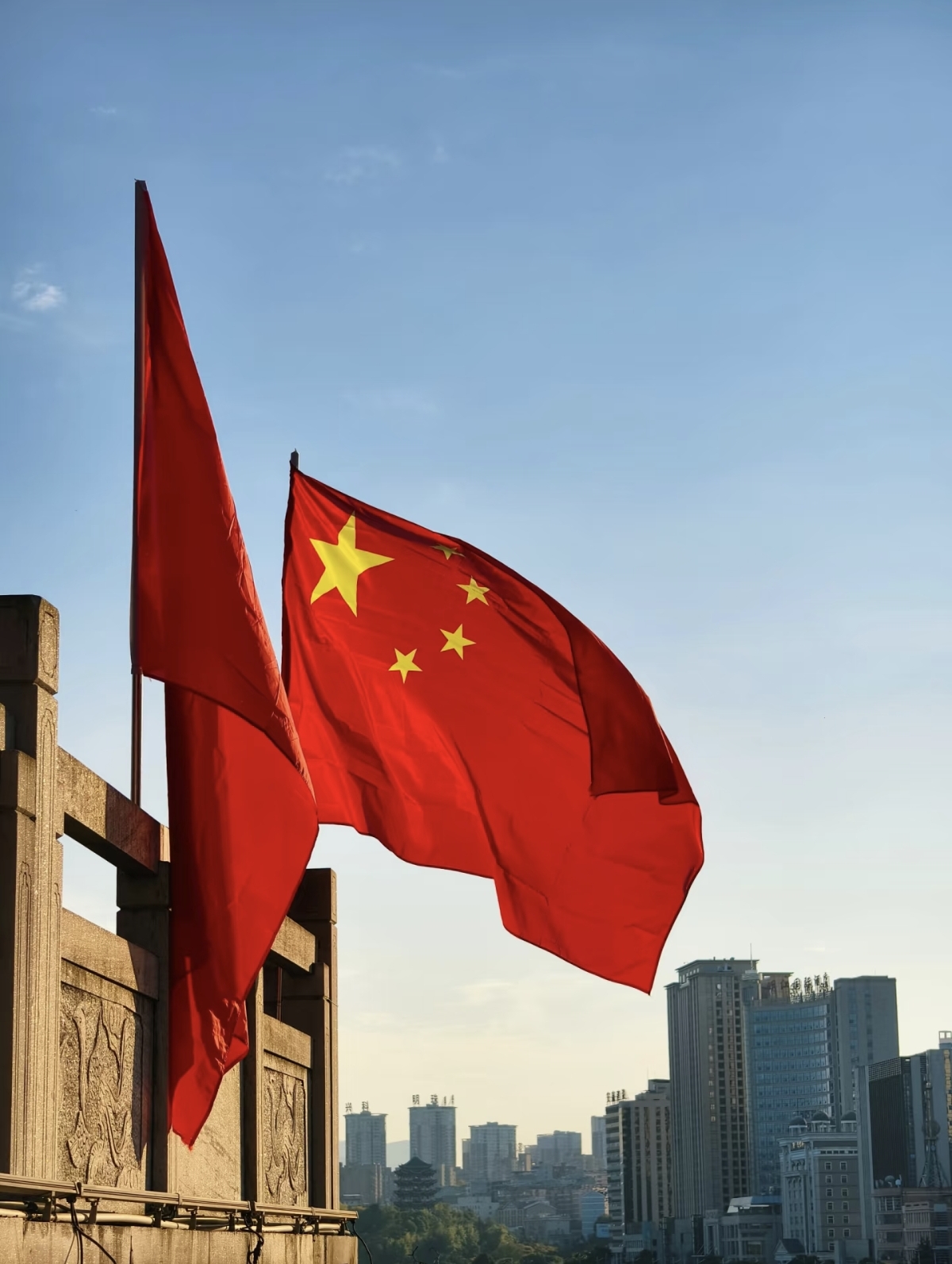 晨光里,五星红旗在城市天际线旁迎风舒展,将家国的赤诚与城市的朝气织进同一帧晨光中(2025级应用化学2班 王珊珊)