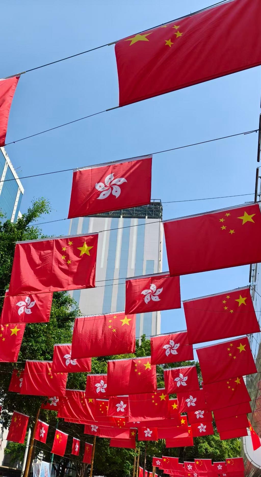 香港街头,国旗与区旗交织成红浪,诉说着“一国两制”下的血脉相依(2025级应用化学(专升本)2班 赵晓慧)